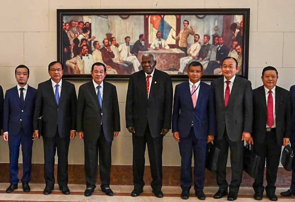 Businessman Chen Zhi, far left, stands with Cambodia's then-Prime Minister Hun Sen, third from left, and Cuban National Assembly President Esteban Lazo Hernández, fourth from left, on Sept. 24, 2022. Chen now owns a quarter of Cuba’s national cigar company. (Cuban National Assembly)